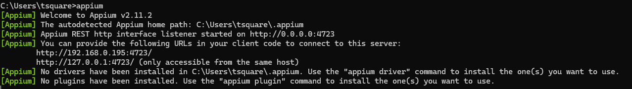 4. Appium - 터미널에서 설치 후 appium을 작성하면 아래와 같은 로그가 표시되면 정상