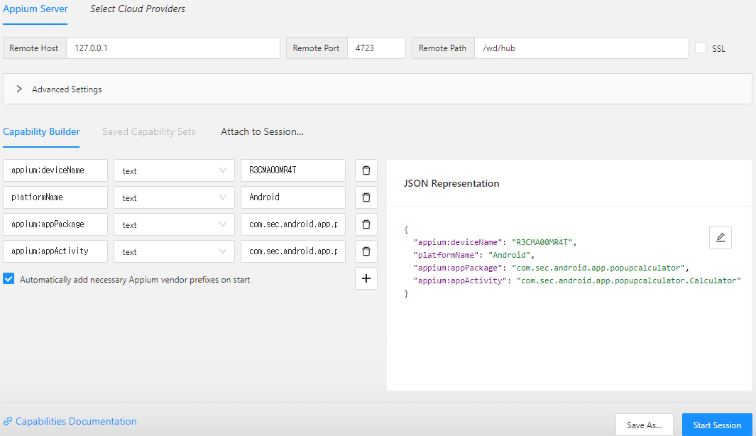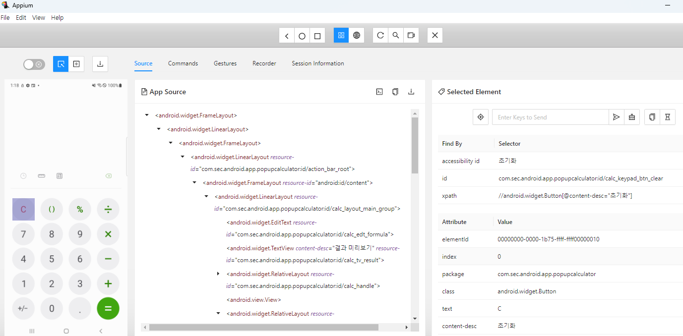 1) 초기 셋팅 및 계산기 appPackage와 appActivity를 읽어서 json으로 출력해줌