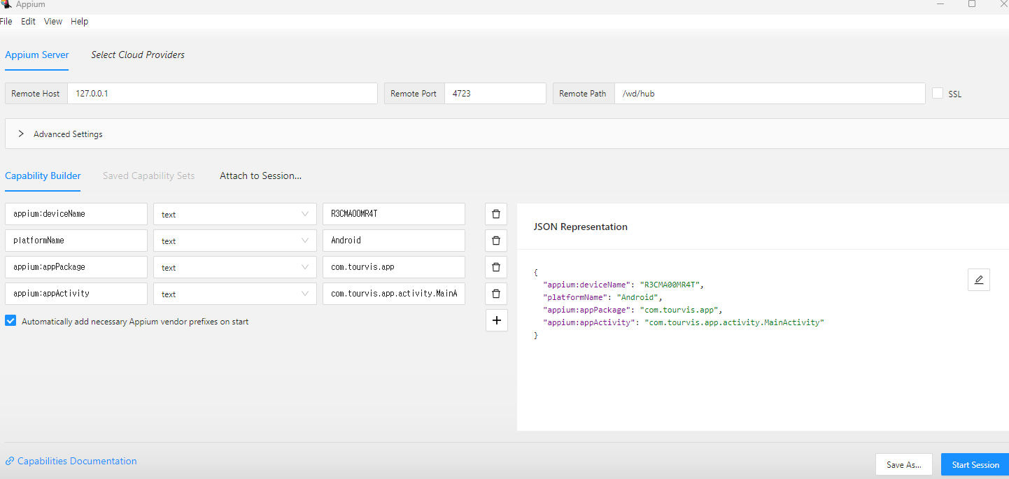 package와 Activity 를 확인해서 작성해주고 Start Session